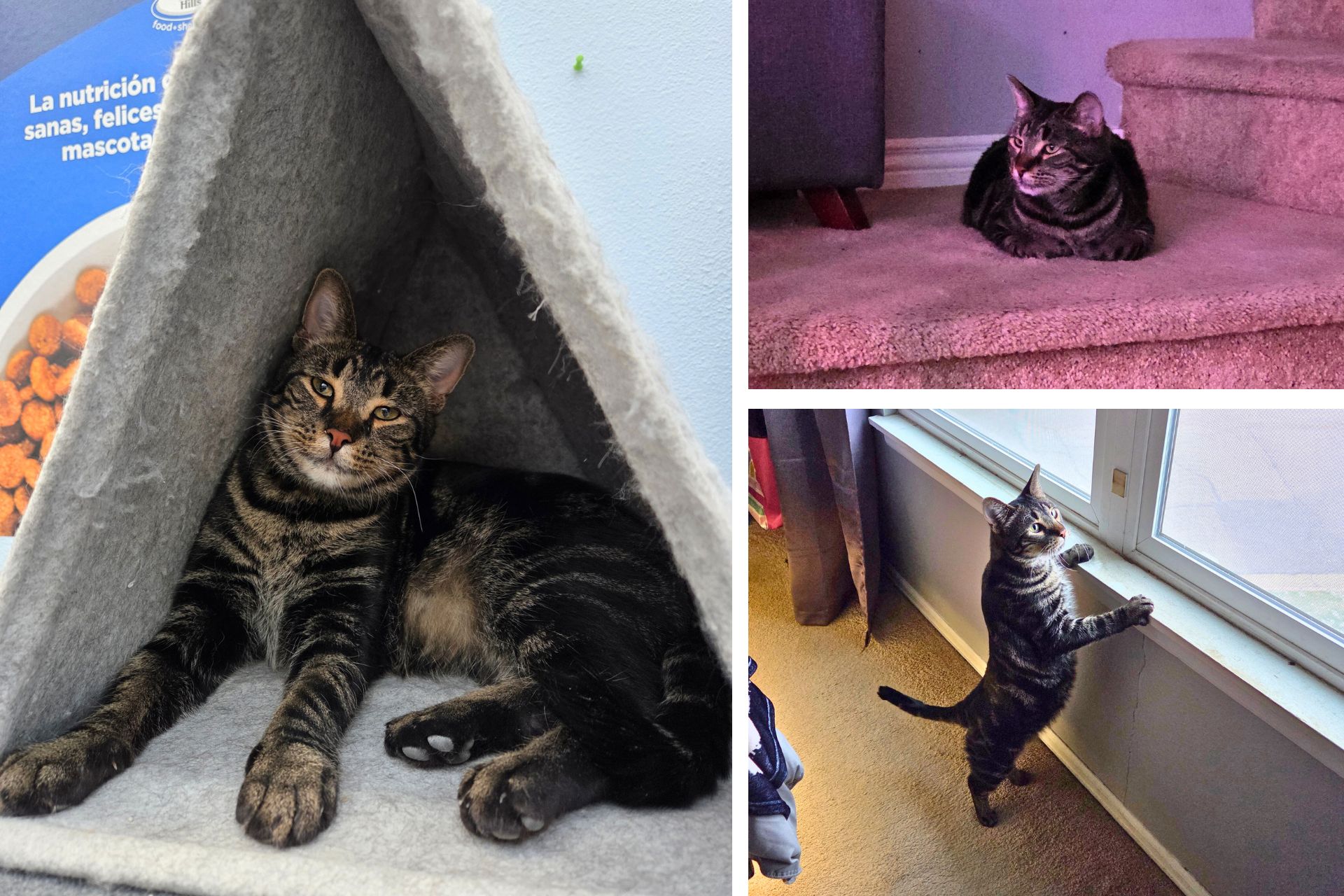 “Shadow is a chatty, funny boy that zooms around the house, but comes for snuggles and a quick nap before taking off again. He can usually be found in my husband’s office, watching the birds and squirrels from the desk. While he prefers the carpeted stairs to the scratch pads we’ve bought, there have been no other behavioral problems.